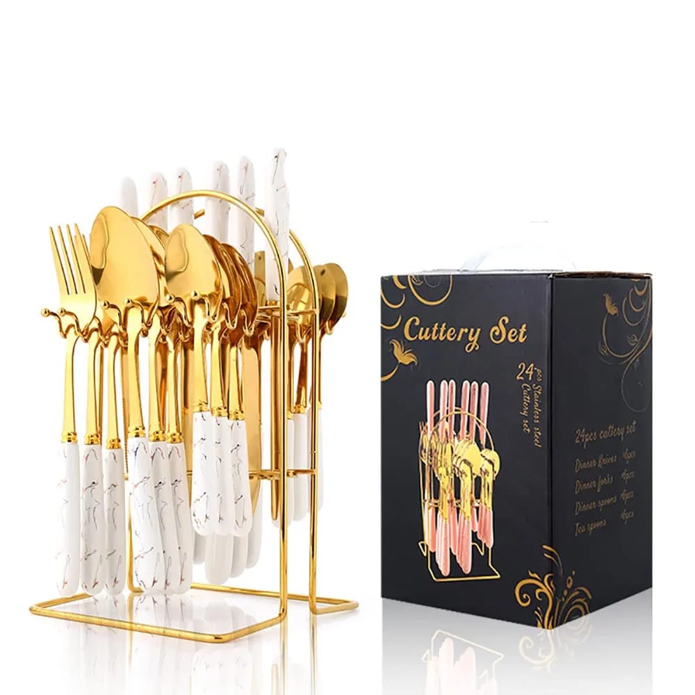 طقم أدوات مائدة انيق يتميز بمقابض بيضاء رخامية (ملاعق شوكه سكين )